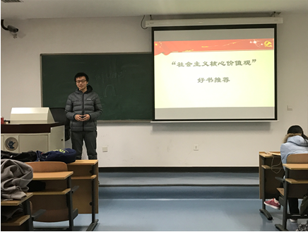班会首先由支书郭俊杉介绍了社会主义核心价值观的基本内容和好书推荐活动的要求。