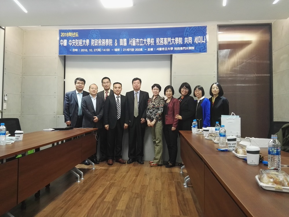 10月27日首尔市立大学税务专门大学院副院长丁智善教授主持研讨会,beat365平台唯一官网樊勇教授、肖鹏教授、梁俊娇教授、李燕教授、杨虹教授、徐涛副教授、庞淑芬副研究员和教务处聂建峰副研究员、薛晋艳助理研究员,首尔市立大学税务专门大学院院长李相信教授、沈台燮教授、朴薰教授、李英漢教授等及中国留学生参加会议研讨。双方就中韩税收征管、政府预算、增值税和个人所得税进行了交流研讨。