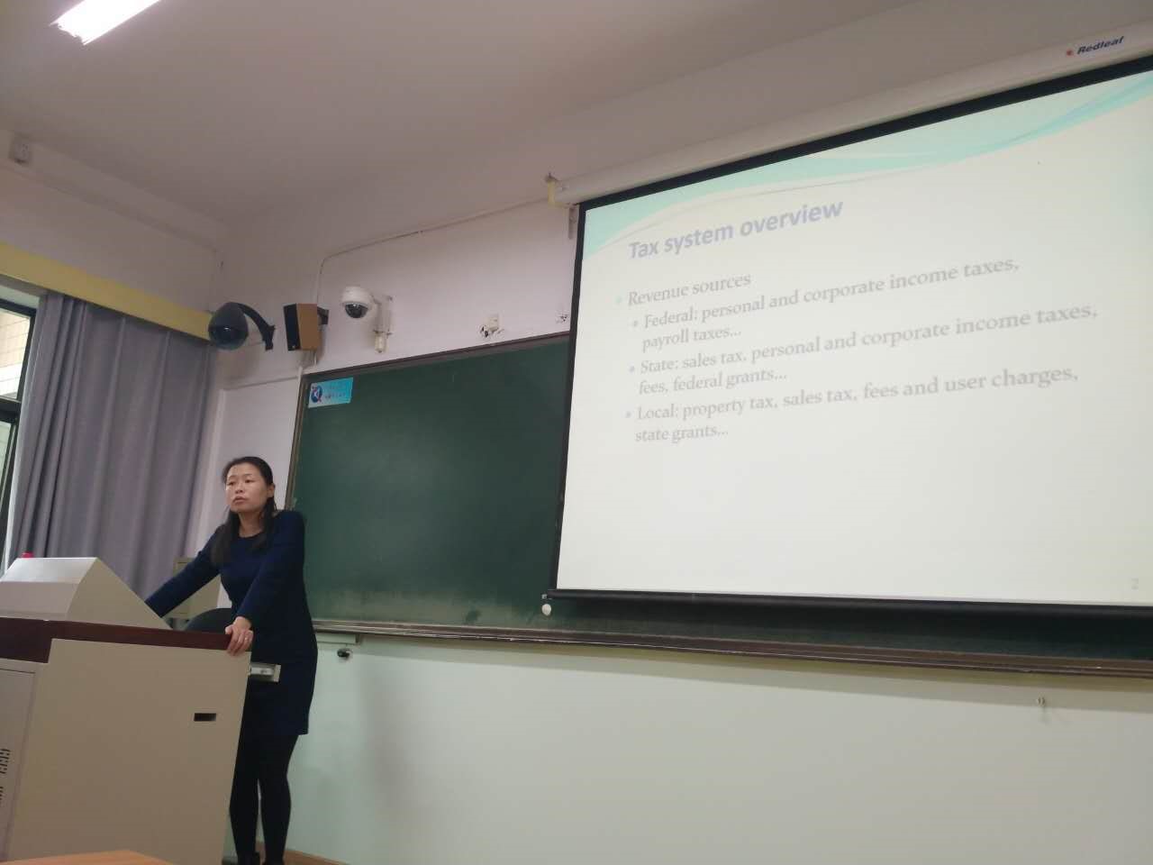 程内容围绕美国税制特点,并以其导师Micksell教授提出的五个税制基本原则(税收充足率、公平、税收中性、征管效率、透明性)对美国联邦、各州等设置的税制进行分析与探讨。参与的老师以及学生就相关部分提出问题进行探讨与交流。王教授介绍由于美国各州有自主征税权,因而每个州的税种与税率都不一致,如有些州有大麻税、苏打税等。每个州提出新的税种或者改变税率都会通过民主投票,在进行民主投票的时候州政府需要将其具体用途以及征收时间等公开。在联邦政府层面,王教授还介绍到美国联邦政府主要依靠工薪税,之所以美国没有采用增值税,主要是因为这与州政府征收的销售税或消费税有一些重复,这样会增加纳税人的税负。