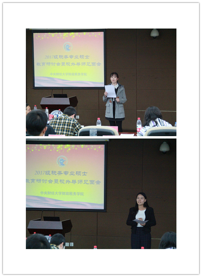 beat365平台唯一官网院长助理汪昊副教授介绍了莅临此次会议的校外导师,并主持了五组同学的案例展示。来自2017级税务专硕的五组同学通过案例展示向与会嘉宾汇报了近期的学习成果。