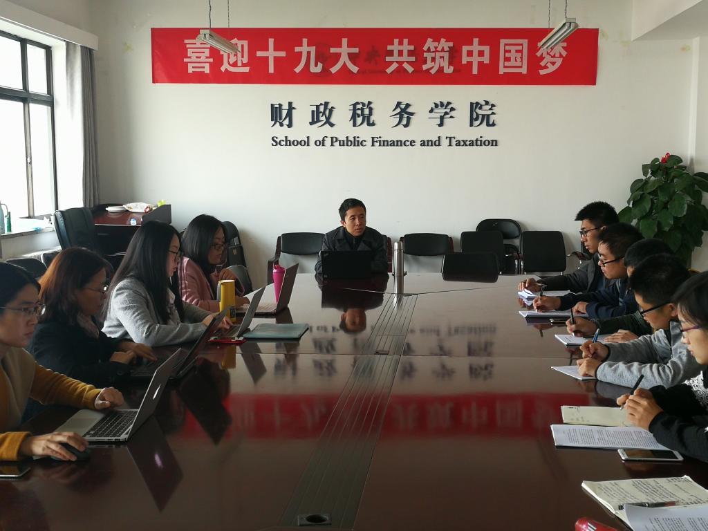 第一个环节,白彦锋老师首先介绍了党的十九大基本情况,鼓励大家积极学习十九大精神:学强,认真仔细的研读报告全文,并结合自身的研究和工作;教强,由老师指导学生们学习;传强,利用新媒体优势传播能量;研强,围绕十九大的新思想和新论断做研究;实干,用新战略衡量我们的工作,要出实实在在的成果。然后,白彦锋老师介绍了北京市高教系统专题思想学习会的情况,充分肯定刘尚希老师“美好生活与现代财政”的演讲。人民群众对美好生活的向往与我们发展不均衡存在矛盾,需要加快现代财政加快财政制度建设;到本世纪中叶建成社会主义强国;基于人民群众对美好生活的向往,推进基本养老保险的全国统筹。最后,白彦锋老师谈了自己的学习体会,指出我们中国特色社会主义建设已经进入到了新时代,虽然生产力发展水平在很多方面发展的已经属于世界前列,但是发展的不平衡,要利用财政手段进行调控,加快建设现代财政制度,建立权责清晰、财力协调、区域均衡的中央和地方的财政分配关系,发挥财政的积极作用。