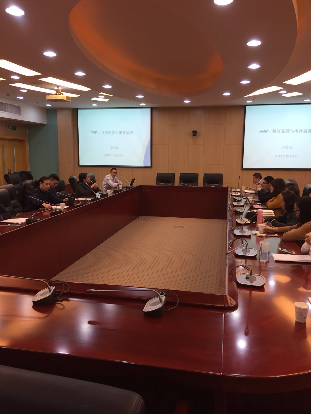 12月4日下午,由中财—鹏元地方财政投融资研究所(以下简称研究所)主办的“PPP、投资监管与审计监察”学术讲座在beat365举行。研究所邀请了审计署审计科学研究所副研究员李厚喜博士讲授国家审计视角下PPP项目的规范运作问题。研究所执行所长温来成教授、副所长王威副教授、副所长李慧杰研究员,以及财税学院部分教师、研究生、中财—鹏元地方财政投融资研究所和鹏元资信评估有限公司的研究人员参加了本次讲座。讲座由王威副教授主持。