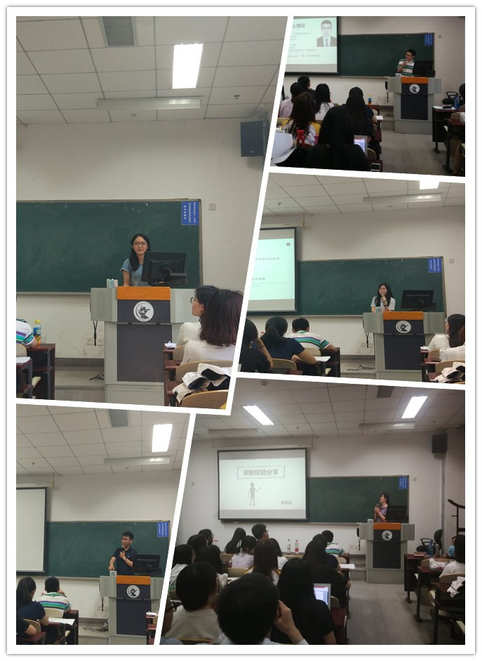 王雁翔同学分享了她参加选调生选拔的经验,她建议同学们要多关注不同省份选调生的招聘消息,有针对性地进行准备。郑植同学主要分享了寻找暑期实习的经验,他建议同学们要注意思考公司有没有留用机会和自己想不想在这份实习中留用这两个问题,以便尽早决定自己的求职目标。王程祥同学为学弟学妹们介绍了不同行业的优秀公司,为同学们投递不同的公司和岗位开阔了思路。高皓洁同学分享了她考取公务员的经验,为同学们找工作、考公务员、考注册会计师等证书的协调做出了建议。黄静涵同学按照求职流程做了详细的经验分享,给出了很多小tips,并建议同学们在求职过程中要保持良好的心态。