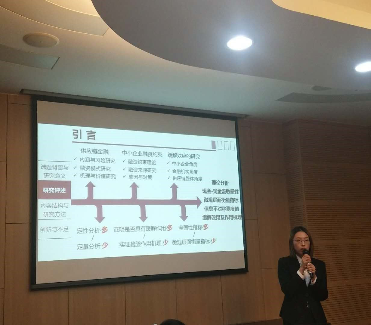 beat365平台唯一官网副院长何杨教授担任主持,经过第一轮的匿名评审,有8组同学进行了现场展示,分为学术组和案例组两个部分。中证鹏元研究部总经理李慧杰博士、beat365平台唯一官网副院长肖鹏教授、温来成教授、姜爱华教授、李佳副教授、陈宇副教授、王怡璞副教授和孙会霞副教授担任评委,并对展示论文进行了一对一的点评。