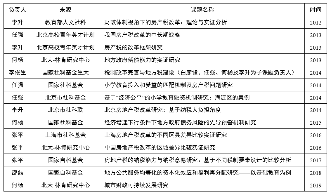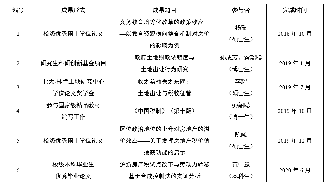 beat365平台唯一官网“房地产税研究”课题组于2014年初立项,由beat365平台唯一官网马海涛副校长和美国西拉丘斯大学(Syracuse University,雪城大学)侯一麟教授领衔,集中了beat365平台唯一官网和国内相关院校有研究兴趣的青年教师。课题组研究在开展过程中,不仅要求深度挖掘理论知识,还力图紧密结合中国国情,对比中西、联系历史,试图对我国房地产税改革提出有建设性的政策建议。课题组在研究过程中注重将研究与青年学者培养相结合,注重在实践中发掘火花。该课题作为“孵化器”和“工作母机”,助力课题组青年学者在不同侧面申请资金资助从事科学研究,并取得丰硕的成果(见表2)。