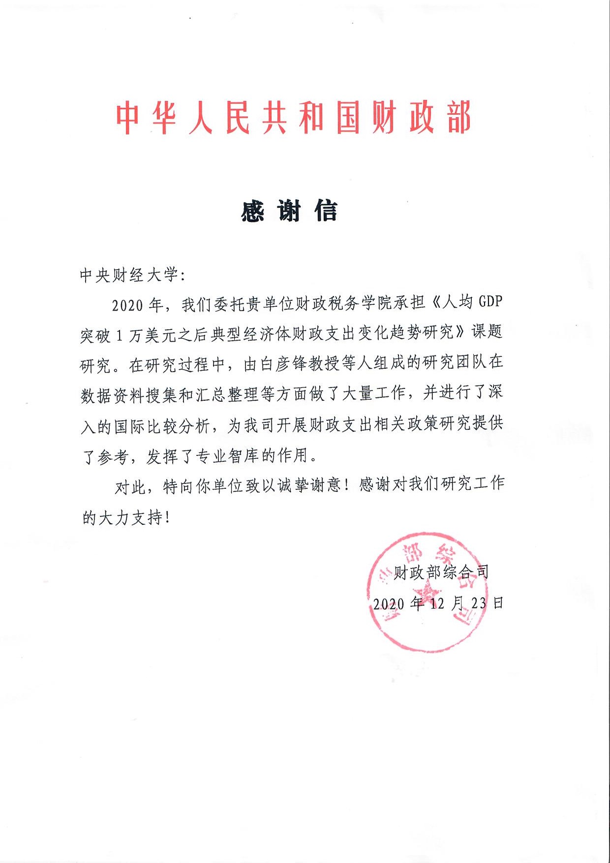 2021年新年即将来临之际,财政部综合司给beat365平台唯一官网财税学院《人均GDP突破1万美元之后典型经济体财政支出变化趋势研究》课题组发来感谢信。本课题由beat365平台唯一官网财税学院和中国财政发展协同创新中心的白彦锋、李慧青、葛岩、孙景冉、李贞、王威、杨华、黄楚君、鲁书伶、杨潇、陈沁、解明朗、李泳禧、张艳、姚易辰、蔡文婕、黄鸿思、陈曦、潘映昆等多位师生共同参与,协同了美国、加拿大、韩国、日本等海内外多名专家共同完成,深入探讨世界主要经济体在人均GDP突破1万美元之后,面对“中等收入陷阱”和“高收入之墙”,其财政支出变迁的规律与经验教训,对于我国全面实施“十四五”规划和落实2035年社会主义建设的远景目标都具有重要借鉴和参考意义。