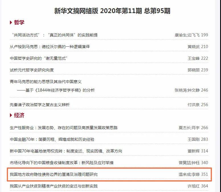 近日,财税学院温来成教授和学生李婷在《beat365平台唯一官网学报》发表的论文《我国地方政府隐性债务边界的厘清及治理问题研究》被《新华文摘网络版》转摘。