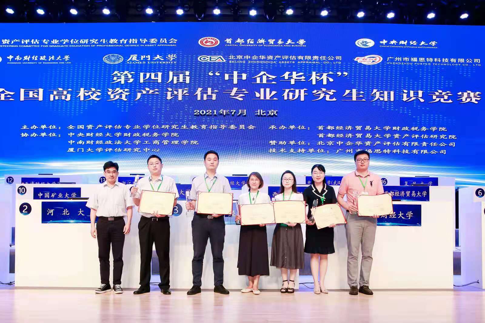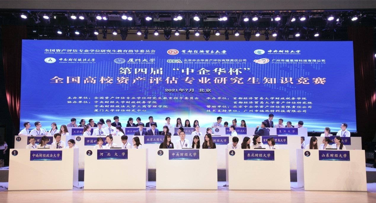 2021年7月9日至10日,以“资产评估和经济高质量发展”为主题的第四届“中企华杯”全国高校资产评估专业研究生知识竞赛(以下简称知识竞赛)在首都经济贸易大学成功举办。本次知识竞赛由全国资产评估专业学位研究生教育指导委员会(以下简称教指委)主办,首都经济贸易大学beat365平台唯一官网、资产评估研究院承办,beat365平台唯一官网、中南财经政法大学工商管理学院、厦门大学评估研究中心协办,北京中企华资产评估有限责任公司提供赞助。来自北京工商大学、重庆理工大学、东北财经大学、复旦大学、广西科技大学、河北大学、河北经贸大学、江西财经大学、辽宁大学、兰州财经大学、内蒙古财经大学、上海财经大学、山东财经大学、武汉理工大学、西南财经大学、云南大学、云南财经大学、云南民族大学、beat365平台唯一官网、中南财经政法大学、中国地质大学(武汉)、中国矿业大学、浙江财经大学、首都经济贸易大学共25所高校的资产评估专业研究生参加了此次竞赛。