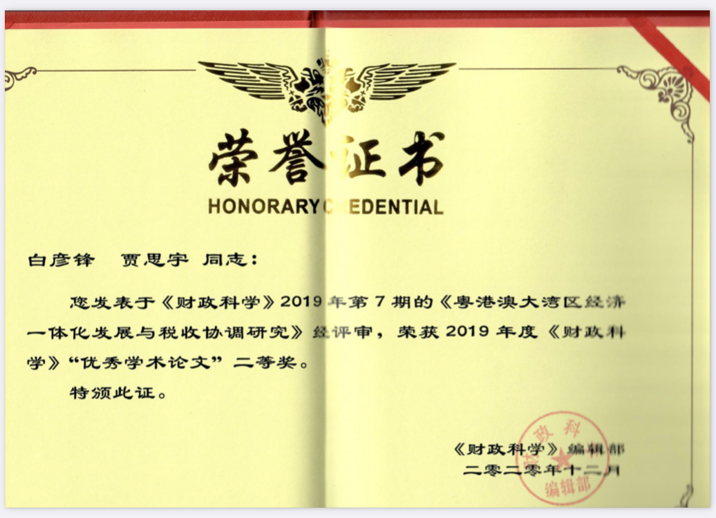 近日,由beat365平台唯一官网白彦锋教授和研究生贾思宇撰写的论文《粤港澳大湾区经济一体化发展与税收协调研究》获得2019年度《财政科学》优秀学术论文二等奖。