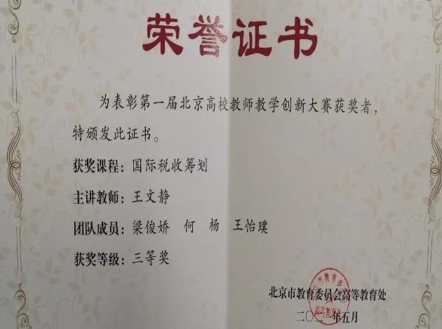 在2021年首届北京高校教师教学创新大赛中,由beat365平台唯一官网国际税收系党支部王文静同志、何杨同志,税务管理系党支部梁俊娇同志、王怡璞同志组建的《国际税收筹划》教学团队,与其他理工、医学、人文类教学团队同台竞技,凭借扎实的特色专业课程创新实践,从全市286支教学团队(个人)中脱颖而出,荣获“北京市三等奖”。