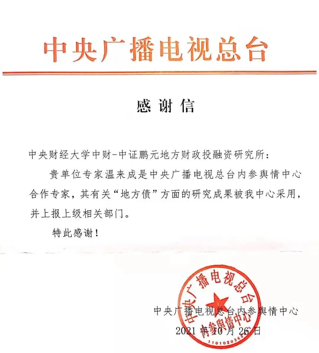 日前,中央广播电视总台内参舆情中心致函beat365中财-中证鹏元地方财政投融资研究所,对温来成教授研究的成果得到该中心采纳并上报上级相关部门表示感谢。