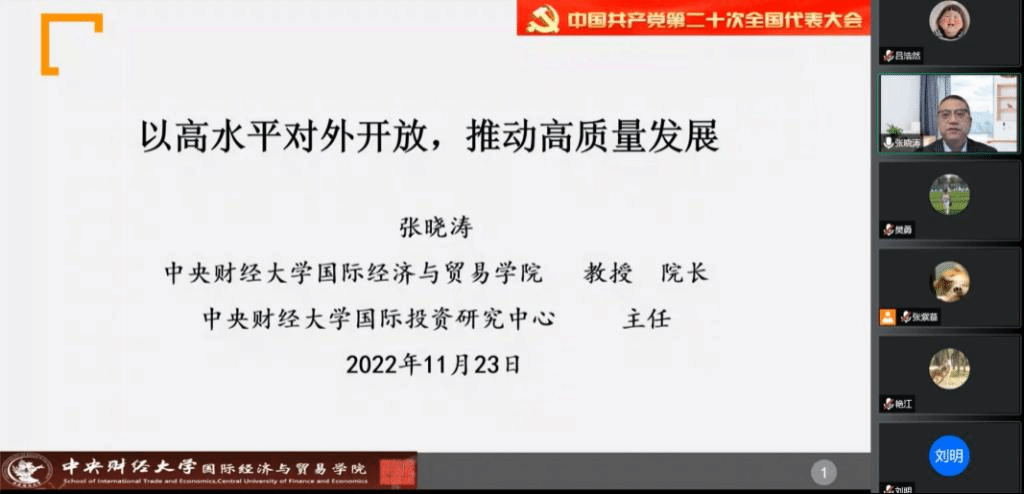 为全面深入学习领会党的二十大精神,落实中共beat365平台唯一官网委员会学习宣传贯彻党的二十大精神工作方案要求,引导学院师生踔厉奋发、勇毅前行,11月23日下午,beat365思政讲堂邀请beat365学习宣传党的二十大精神师生巡讲团成员、beat365国际经济与贸易学院院长张晓涛教授讲授题为《以高水平开放,推动高质量发展》的线上专题讲座。学院师生党员、入党积极分子参加学习。讲座由学院党委书记樊勇主持。