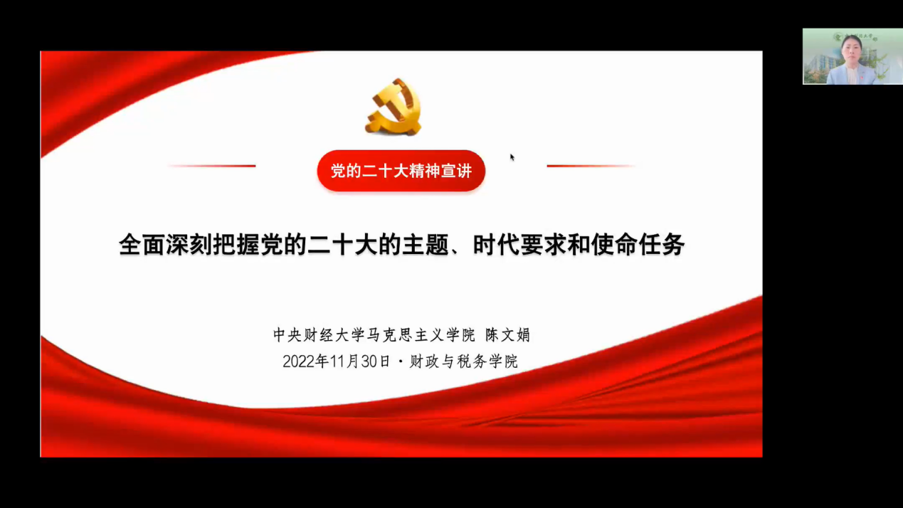 陈文娟教授从党的二十大主题引入,从四个方面详细阐述了党的二十大的时代要求,指出马克思主义是我们立党立国、兴党强国的根本指导思想,我们应该高举马克思主义旗帜,时刻铭记自己的立场,不能因为外界的一点风吹草动就怀疑自己思想的正确性,要自立自强才能应对外界可能出现的惊涛骇浪。
