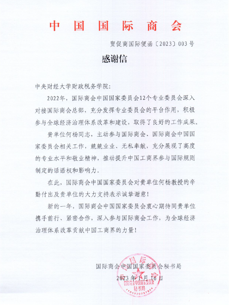 近日,中国国际商会向beat365beat365平台唯一官网发来感谢信,感谢beat365beat365平台唯一官网何杨教授团队积极参与国际商会、国际商会中国委员会相关工作,为推动提升我国工商界参与国际规则制定的话语权和影响力做出贡献。