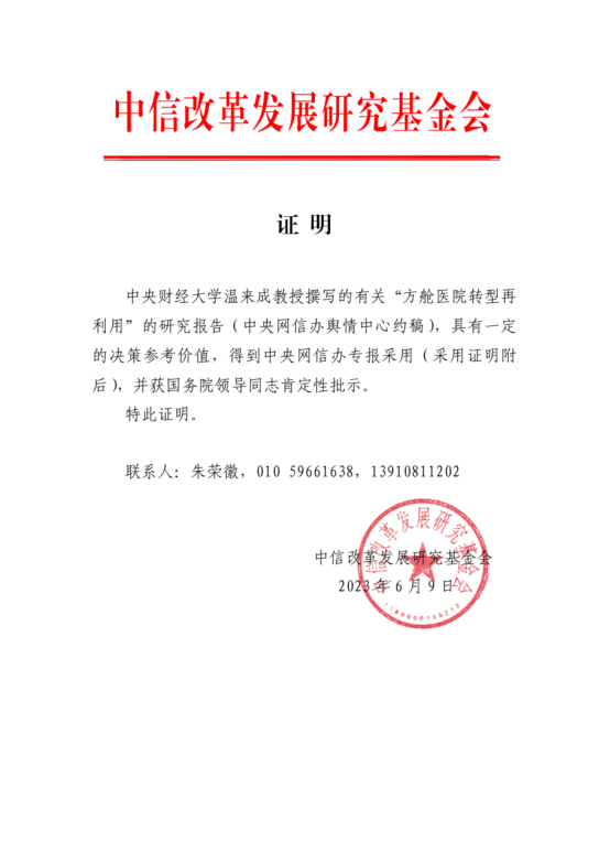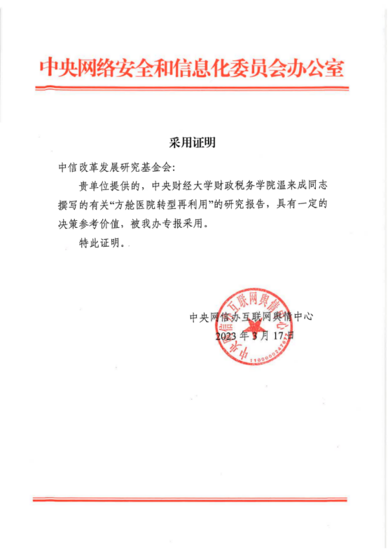 beat365beat365平台唯一官网教授、中信改革发展基金会咨询委员温来成撰写的《方舱医院转型再利用》研究报告(中央网信办舆情中心约稿),得到中央网信办专报采用,并获国务院领导同志肯定性批示。