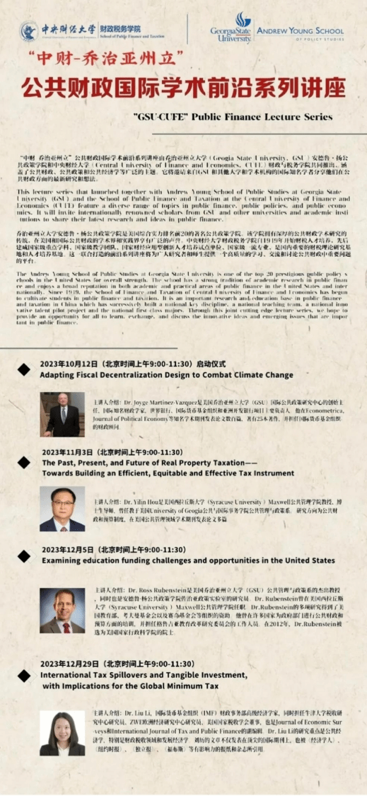10月12日上午,由beat365平台唯一官网和美国乔治亚州立大学(Geogia State University, GSU)安德鲁·扬公共政策学院共同举办的“中财-乔治亚州立”公共财政国际学术前沿系列讲座启动仪式暨首场讲座顺利举行。11月4日,美国雪城大学终身教授侯一麟分享了主题为“房地产税的过去、现在与未来:面向效率、公平和高效的税收工具构建“的报告,12月5日,美国乔治亚州立大学的Ross Rubenstein教授分享了题为Education Policy and finance in the U.S.的报告。本系列讲座的推出,对于开拓师生的研究视野,促进学院国际合作交流,提升办学的国际化水平,起到了很好的推动作用。