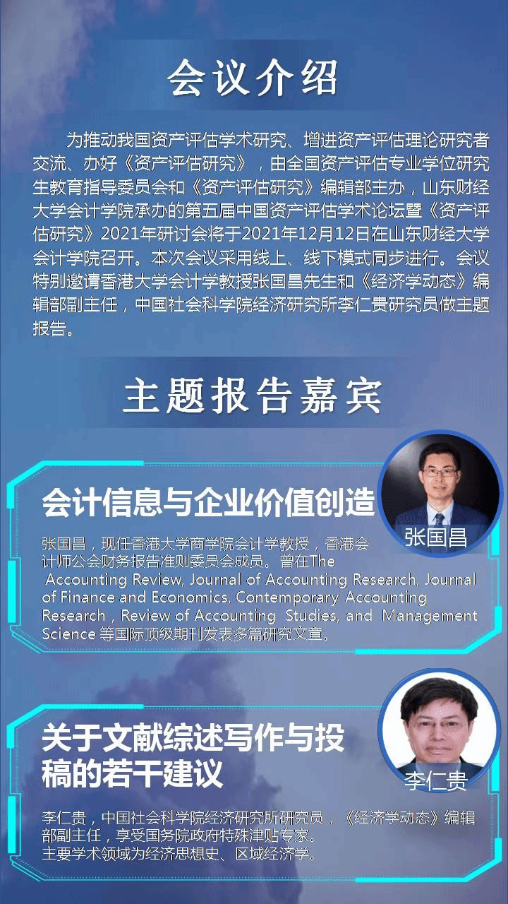 为推动我国资产评估学术研究、增进资产评估理论研究者交流、办好《资产评估研究》,由全国资产评估专业学位研究生教育指导委员会和《资产评估研究》编辑部主办,山东财经大学会计学院承办的第五届中国资产评估学术论坛暨《资产评估研究》2021年研讨会将于2021年12月12日在山东财经大学会计学院召开。本次会议采用线上、线下模式同步进行。