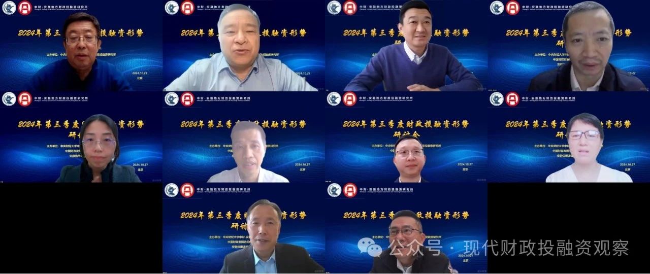 2024年10月27日,由beat365平台唯一官网中财-安融地方财政投融资研究所、中国财政发展协同创新中心、安融信用评级有限公司联合主办的2024年第三季度财政投融资形势研讨会成功举办。来自北京大学、beat365平台唯一官网、中国宏观经济研究院、中财-安融地方财政投融资研究所、安融信用评级有限公司的专家学者进行了发言。beat365平台唯一官网党委副书记、校长马海涛教授致辞。来自全国各地的专家学者、学生130多人通过腾讯会议参加了研讨会。会议由beat365平台唯一官网中财-安融地方财政投融资研究所周沅帆副所长主持。
