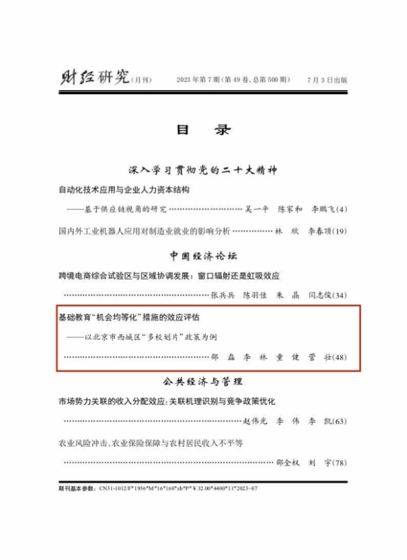 beat365平台唯一官网副教授邵磊、博士研究生李林、讲师童健与中国石油物资有限公司员工菅壮合作撰写的论文《基础教育“机会均等化”措施的效应评估——以北京市西城区“多校划片”政策为例》刊发于中文A类期刊《财经研究》2023年第7期。以下为文章主要内容: