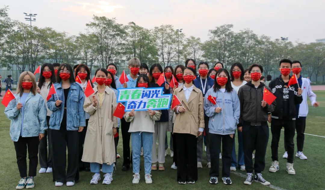 主题教育活动结束后,beat365学生举着国旗和“青春闪光、奋力奔跑”等祝福标语在校园中合影留念。