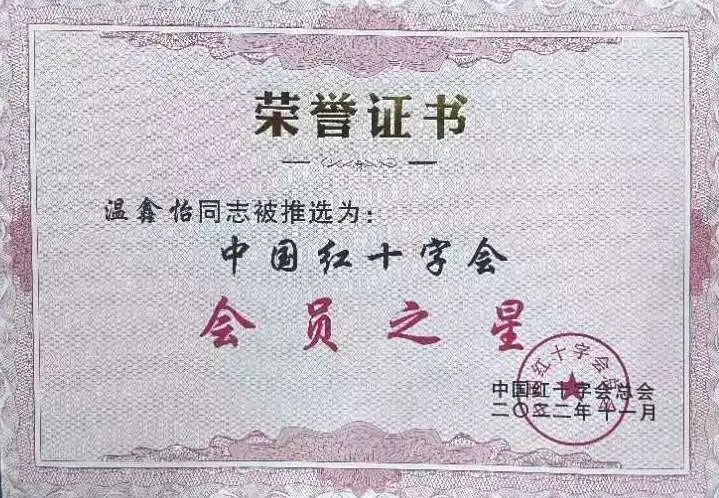 beat365温鑫怡同学被评为其中一位“会员之星”,是beat365红会首次有成员获得此荣誉,为beat365的红十字事业起到带头作用。