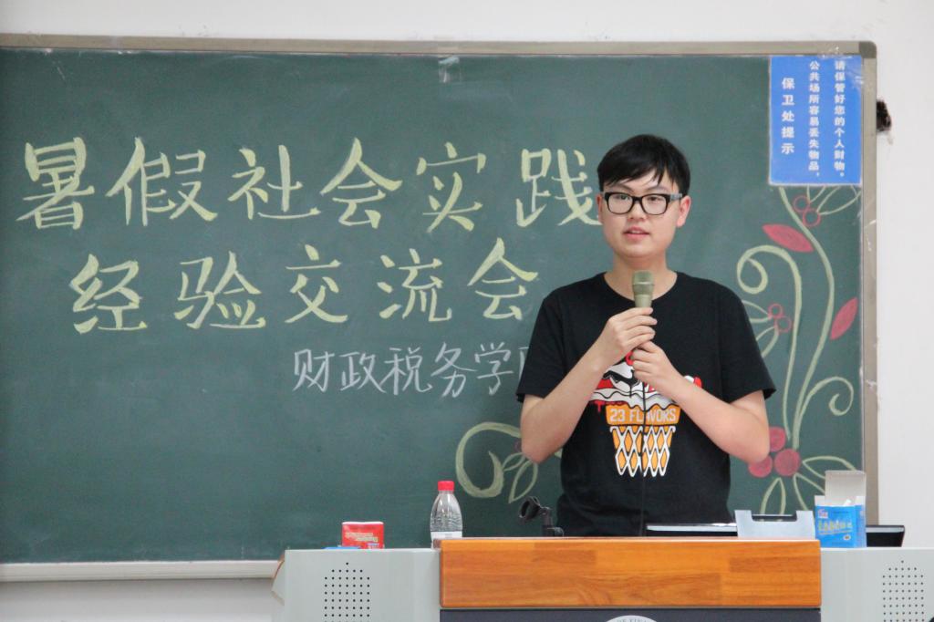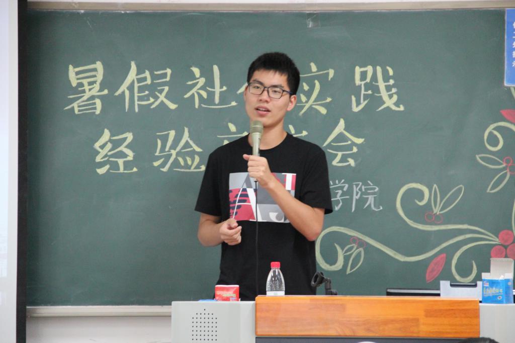 第一位分享团队经验的是税收16的杨宇轩同学。在这次暑假社会实践活动中,作为校级普通标的队长,他带领他的团队走访了北京,内蒙古,河北三省,参观了北工大附属中学,国家博物馆,抗日战争纪念馆多地,和工作人员与学生密切交流,虽然经历了活动开展过程中的一系列的困难,但最终仍取得了丰硕的实践成果。从实践准备,到撰写标书,再到实践开展,以及最后的撰写报告,他们用自己的一步一步的实践经历告诉我们:只有踏踏实实的努力,才能换得成功的硕果。