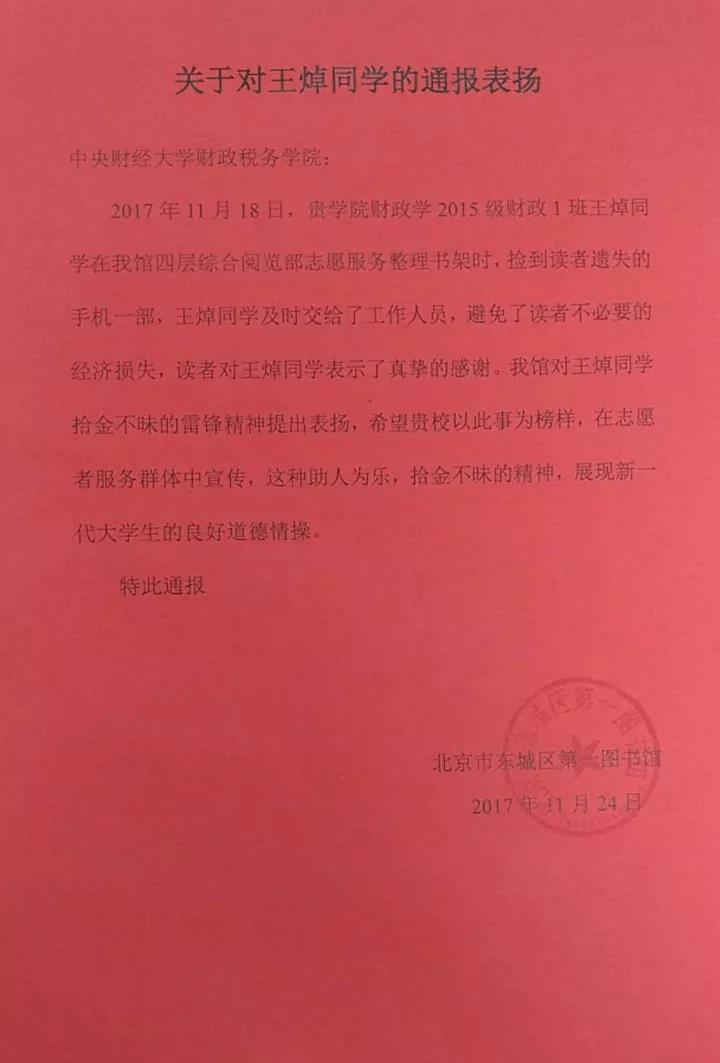 事后,找回手机的读者对王焯同学表达了真挚的感谢,北京市东城区图书馆也对王焯同学拾金不昧的雷锋精神给予了高度赞扬,并给beat365发来了通报表扬信。
