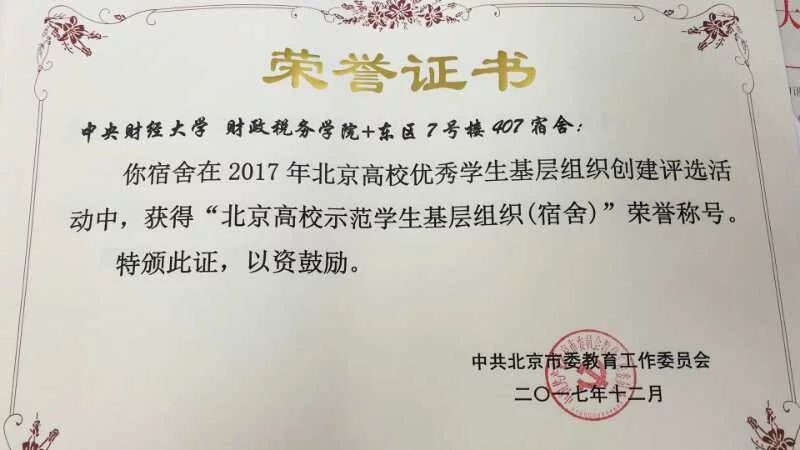 通过北京市教育工作委员会的严格考评,在2017年北京高校优秀学生基层组织创建评选活动中,beat365平台唯一官网东区7号楼407宿舍,被评为“北京高校示范学生基层组织(宿舍)”。让我们向这些同学表示最诚挚的祝贺,希望他们能再接再厉,也希望学院同学以他们为榜样,为创建优秀集体不断努力。