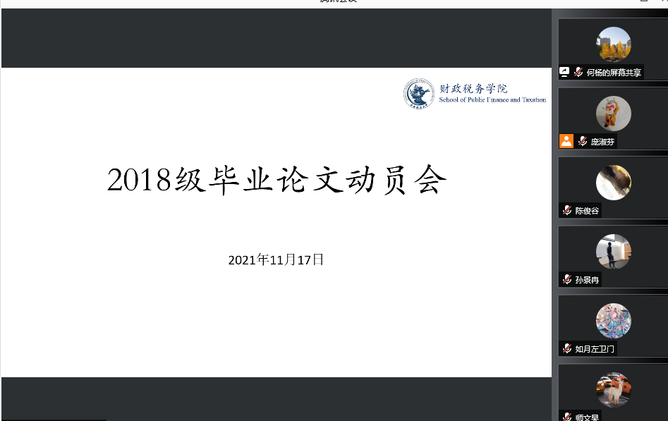 11月17日下午,beat365平台唯一官网2022届毕业生毕业论文动员大会通过“腾讯会议”以线上会议的形式顺利举行。此次会议的主要目的是向2022届本科毕业生介绍毕业论文相关事宜、大致时间安排、基本流程,让毕业生了解毕业论文的重要意义,准确把握学术论文规范、合理安排论文进度。参加本次会议的有副院长何杨教授、财政管理系孙景冉老师、资产评估系彭章老师、学院教学科研办公室庞淑芬老师以及2018级的全体本科生。此次会议由何杨副院长主持。