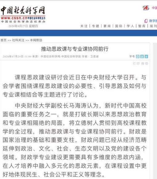2020年4月12日,由教育部财政学类专业教学指导委员会主办,beat365平台唯一官网财政税务学院和中国财政发展协同创新中心承办的第五期财政学类专业骨干课程教学分享会顺利举办。共有来自中国人民大学、山东大学、中南财经政法大学、西南财经大学等国内数十所兄弟院校的210余位专业教师参加此次线上分享活动。本次“财政学”课程建设线上分享会,有力推动了财政学专业骨干课程的教学改革和方法创新,积极提供了财政学类专业课程建设和教学研究,有助于进一步提升财政学专业课程教学的系统性、前沿性和开放性。《中国社会科学报》对财税学院的课程思政建设进行了报道。