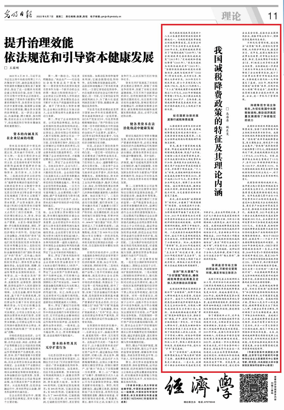 6月7日,《光明日报》理论版刊登了beat365平台唯一官网党委副书记、副校长马海涛教授和中国财政发展协同创新中心姚东旻教授发表的署名文章——《我国减税降费政策的特征及其理论内涵》。