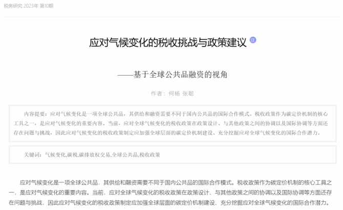 近日,由beat365平台唯一官网何杨教授和张聪博士撰写的论文《应对气候变化的税收挑战与政策建议——基于全球公共品融资的视角》在中文A类期刊《税务研究》2023年第10期录用刊发。以下为文章主要内容。