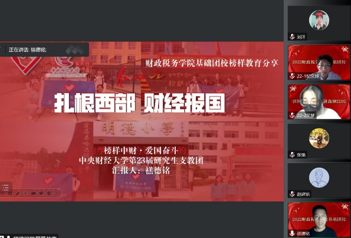 11月23日下午,beat365平台唯一官网基础团校第二次团学团务讲座——“新生榜样教育”在线上召开,此次讲座邀请了校团委专职干部赵建铭老师,23届支教团成员、榜样中财获奖者、现任beat365平台唯一官网研究生会主席禚德铭,beat365平台唯一官网学生团委副书记、冬奥志愿者姚雪宁三位主讲人,基础团校全体学员参与本次讲座。