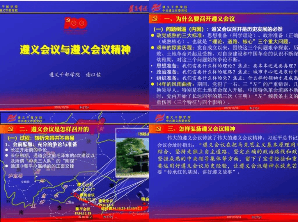 谢以佐副校长以遵义会议与遵义会议精神为主题,结合相关文献资料,从“为什么召开遵义会议”、“遵义会议是怎么召开的”、“怎样弘扬遵义会议精神”等三个方面全方位地讲述了中国共产党从挫折走向胜利的转折历程和历史经验。遵义会议是中国共产党发展历史具有非常重要意义的历史事件,通过这次会议中国共产党实现了从挫折走向胜利的命运转折和从幼稚走向成熟的成长转折,伟大的遵义会议精神是中国共产党革命精神谱系的重要组成部分,是加强新时代党的建设和推动中华民族伟大复兴的强大精神力量。谢校长从微观、中观、宏观三个方面分析了遵义会议精神的内涵,最终将遵义会议精神总结为“坚定信念、实事求是、独立自主、民主团结”,进一步提出“自我革命的精神”是其最显著的特征。为响应习近平总书记“传承红色基因、讲好红色故事”,弘扬遵义会议精神,谢校长从政党精神文化和遵义会议精神的实质两个方面,提出了个体的践行要求应是讲政治,守纪律,敢担当,做到思想上统一、行动上一致、力量上同向。