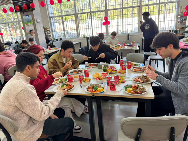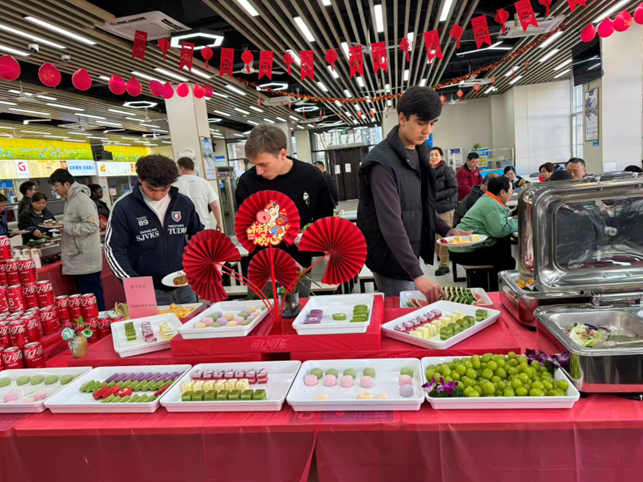 寓意吉祥的佳肴琳琅满目,既有中国传统年菜的地道风味,也兼顾了留学生的饮食习惯。留学生们在享受美食的同时,也积极学习春节习俗与文化,在欢声笑语中沉浸式感受中国年的独特韵味。