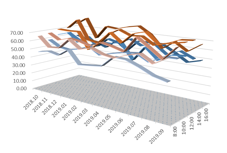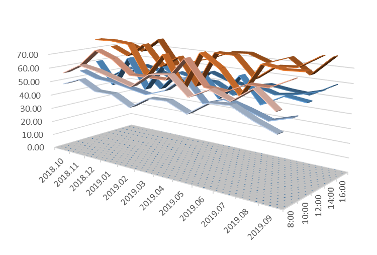 说明:图1至图4下方三维带状折线代表室内分贝值,上方三维带状折线代表室外分贝值。