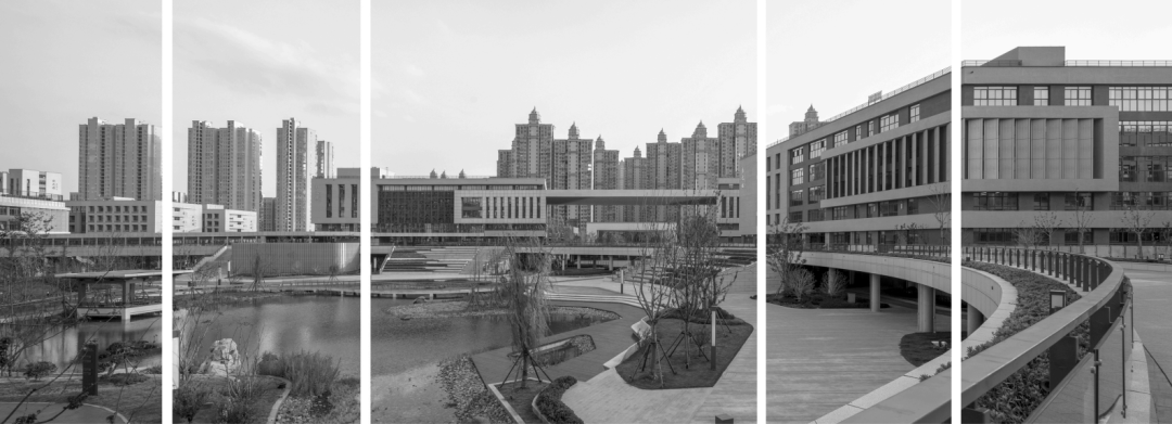 以“未来学校”为校园规划目标,探索学习空间多样化,构建学习社区,设置了STEAM、演奏教室和心理咨询等新型教学空间。其次,营造校园空间的无限活力——开放的公共空间营造出乐活、乐学、乐享的学习氛围,园林式校园激发学子们的学习、交流、运动、思考、梦想......南入口层层叠叠的大台阶承载着六中历史记忆,也是学子们回校留影的最佳场景;笔直的天桥与弧形空中连廊一气呵成,环抱着温馨的中心花园,跨越并向东延伸。第三,激情的几何形体创造了极具个性的现代建筑形象。第四,体验自然魅力,营造绿色生态的校园——水面、庭院、连廊、立体种植共同营造出生机勃勃的自然景象。