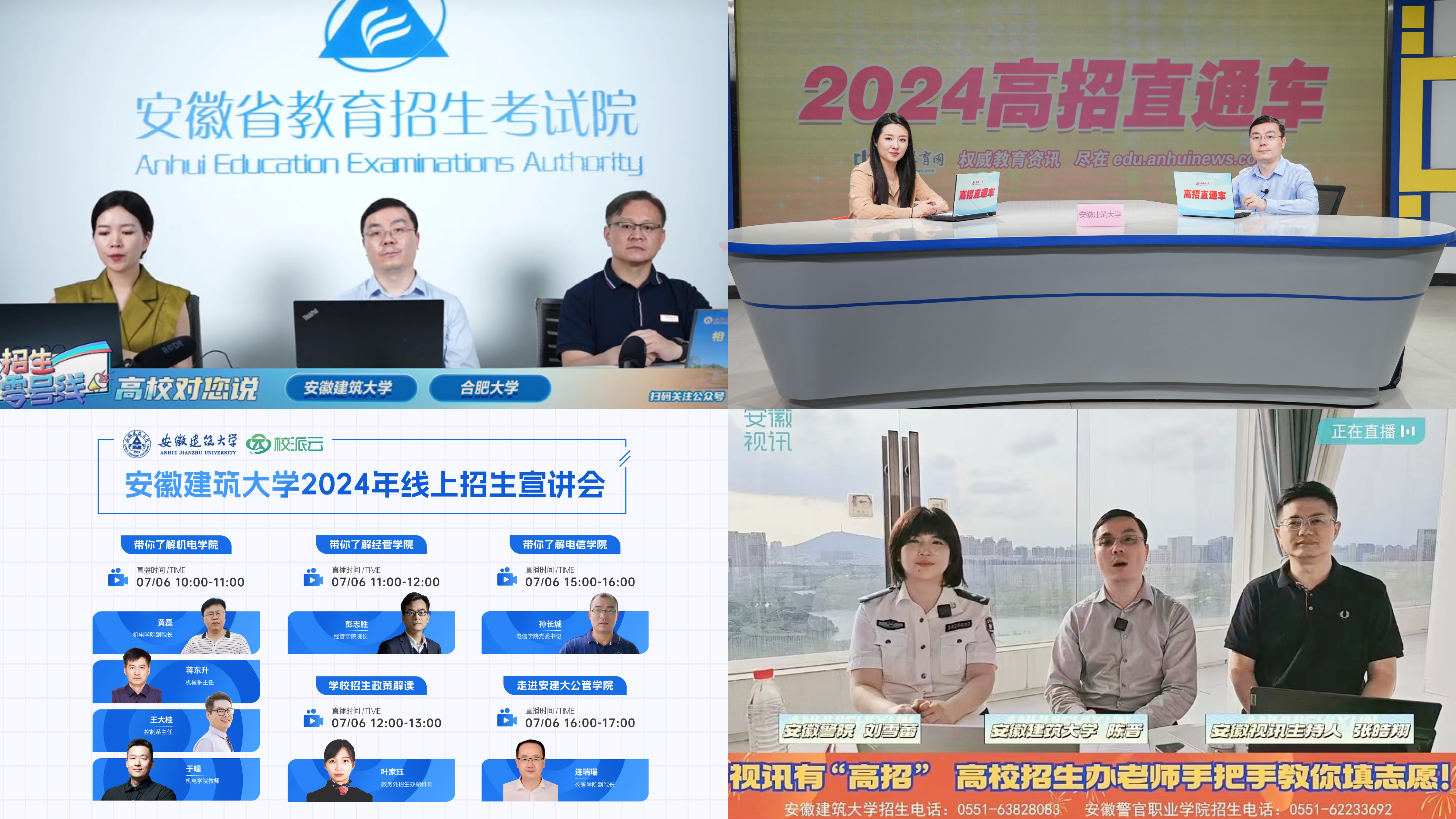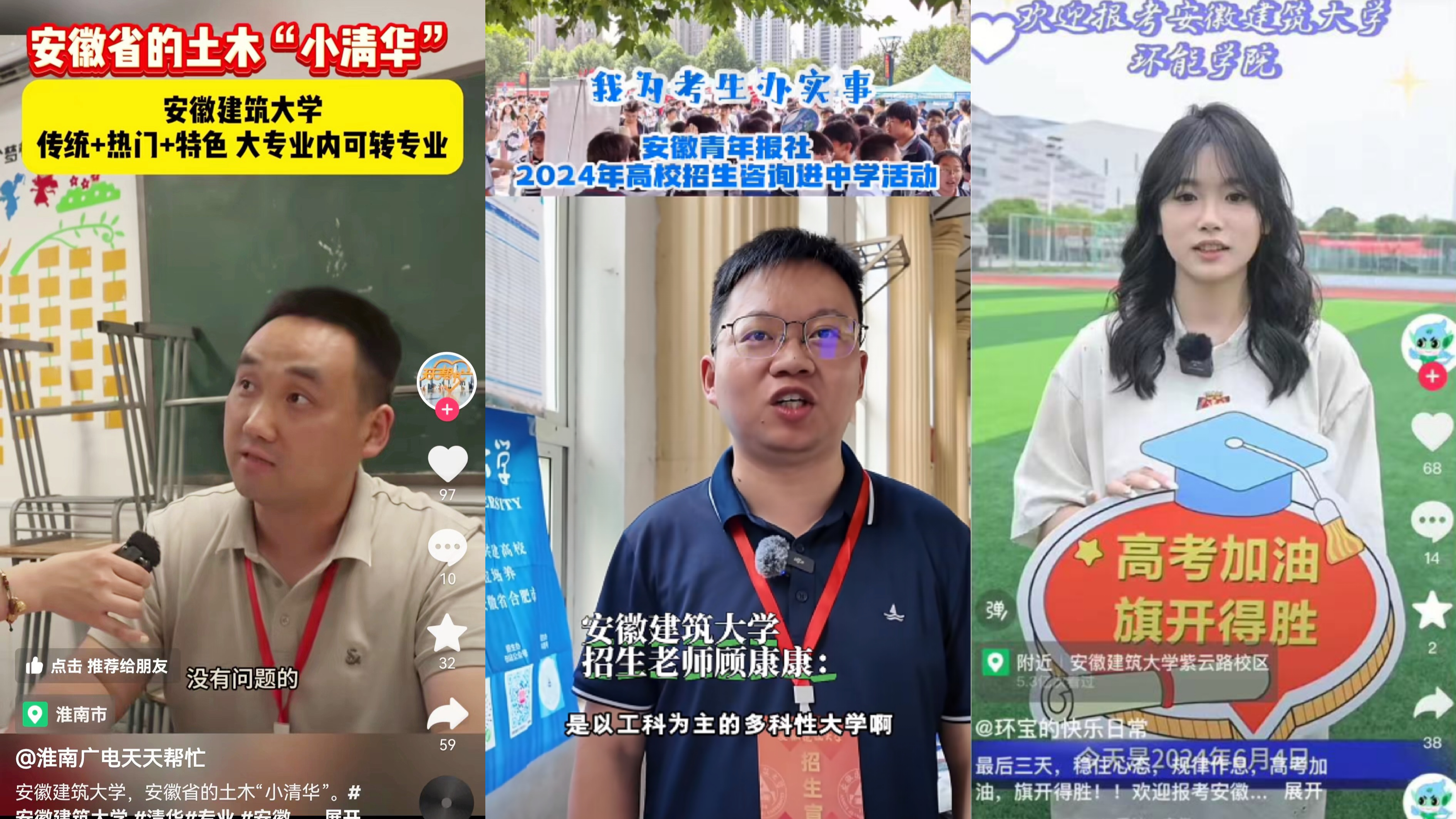 线上宣讲方面,应安徽广播电视台、新安晚报、中安在线等省级媒体邀请,举行多次现场直播,首次在安徽省考试院开展官方招生政策线上讲座,直播活动在抖音、微信、微博、百度、快手等国内主流媒介同步发布,登上微博同城热搜,累计观看量逾500万人次,点赞量超30万次,建大声音传遍江淮大地。