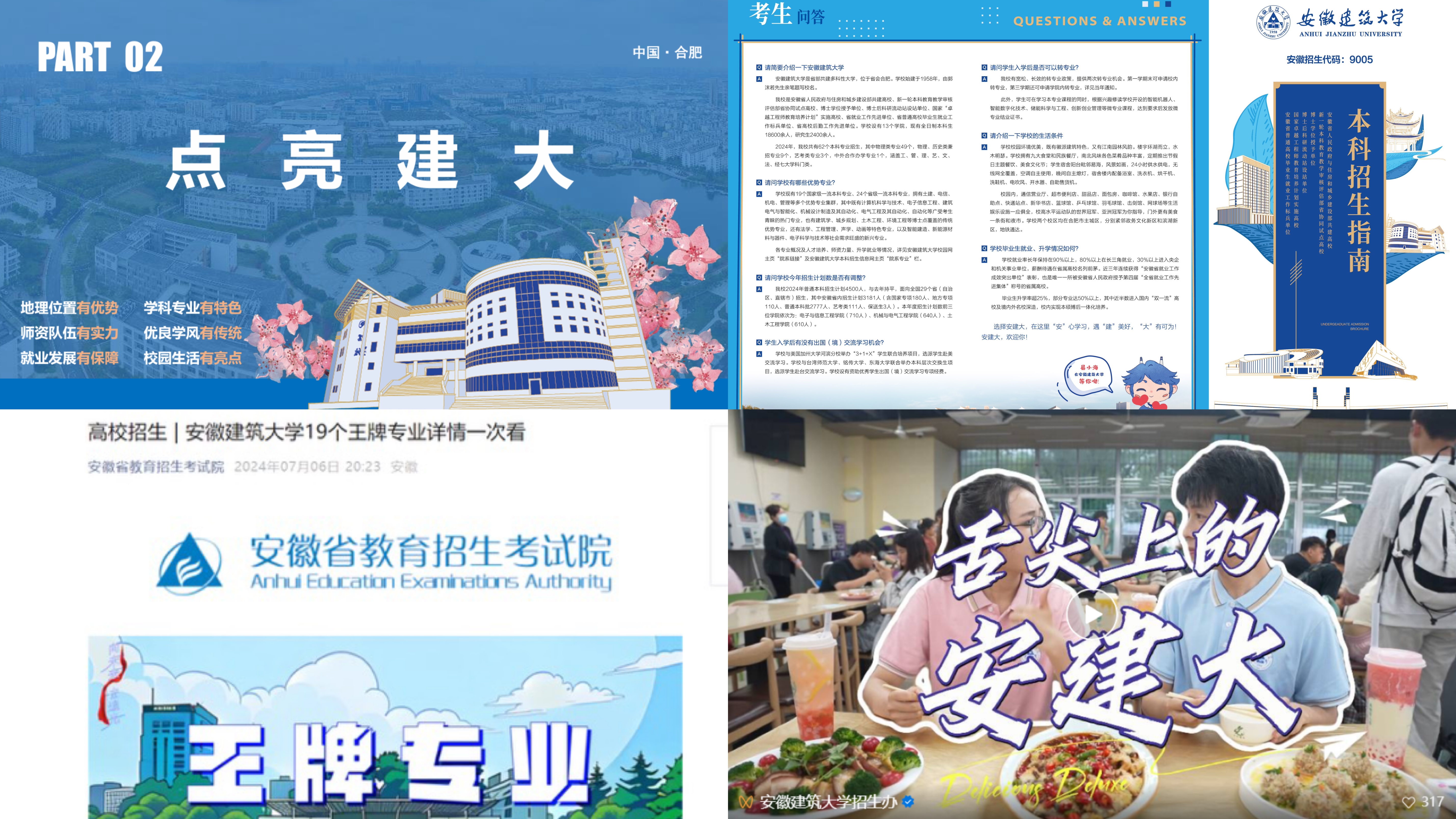 招生办依托前期考生问卷、自媒体评论区大数据,认真归纳分析,从“考生了解学校”到“学校了解考生”,以考生诉求为抓手,挖掘专业内涵,按传统优势专业、近年热门专业、新办专业和特色专业等单元设计招生宣传海报、报考指南、宣讲指南和“带你了解安建大王牌专业/专业组”系列推文,针对不同受众制作四版PPT,让广大考生及家长对学校多科性办学定位和各类学科特点得到全面、准确的认识,有效提升报考意愿;充分把握新时期考生对获得感、认同感和审美感的需求,按需定制,推出三期“舌尖上的建大”宣传片、招生宣传动画片;集合徽派建筑、园林与现代建筑流派元素,设计新生通知书及“易海书山”文创书签,展现建筑类院校历史文化特色,各项宣传材料得到考生普遍好评。