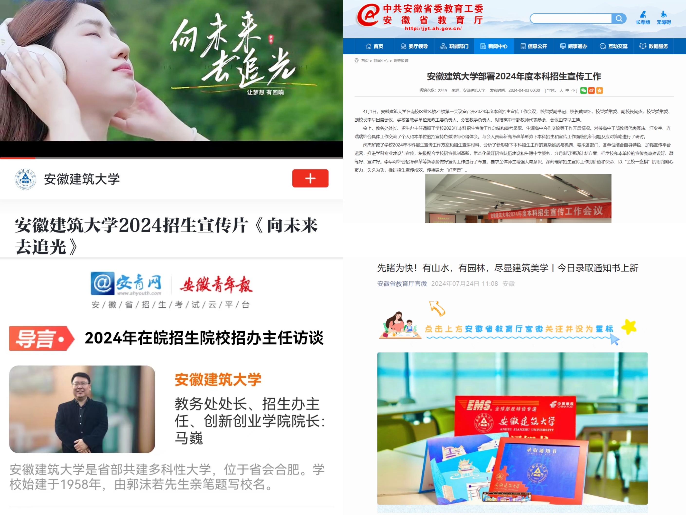 本年度,继学校招生宣传视频在央视新闻频道播出后,年度本科招生宣传片再次登上国家级媒体,获学习强国全国平台遴选发布,系学校外宣作品首次亮相该级别平台。教务处招生办设计制作宣传片2部、招宣视频27个、推文228篇,获安徽教育网、安徽青年报、中安在线等省级媒体和安徽省教育厅、省考试院等省级主管部门官微推送33次,总点击量逾600万次。