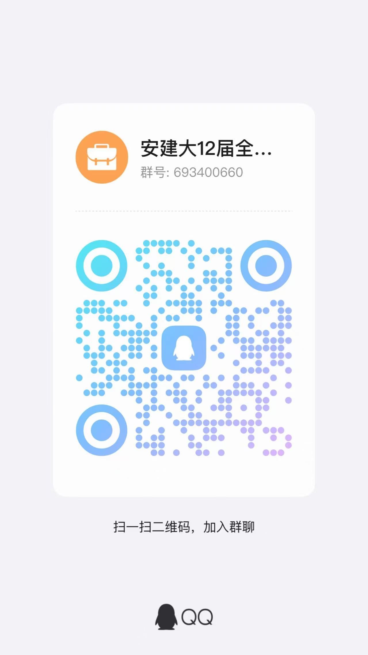 为方便参赛同学交流学习,大赛组委会将建立校内交流群(群号:693400660),群二维码见下图,请参赛同学及时加入。联系人: 李燃老师(QQ:348935710)