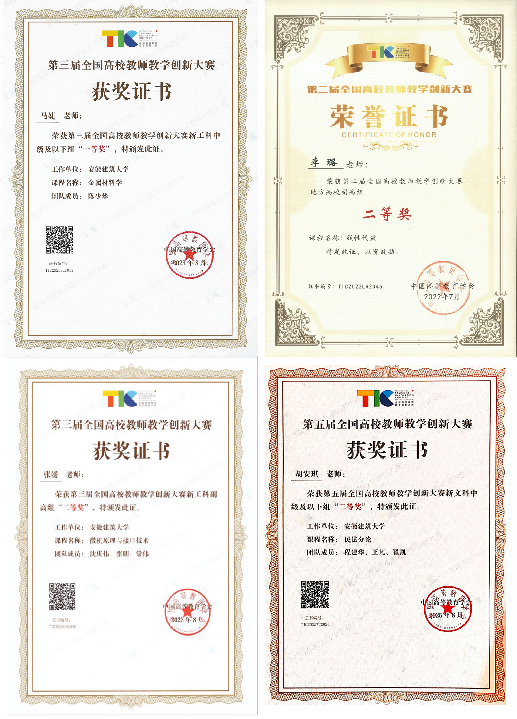 课程建设成果丰硕,2025年度获批第三批国家级一流本科课程10门,创历史新高,“十四五”期间共获批国家级一流课程17门,省级五类“金课”57门,积极探索“AI+教育”与案例库建设。教材建设与管理机制完善,获批省级教材建设项目27项,10门教材入选住房城乡建设领域学科专业“十四五”规划教材,获批立项安徽省首批“十四五”普通高等教育本科省级规划教材2项,数字教材4项,新编教材3项。优质教学资源供给能力持续增强。