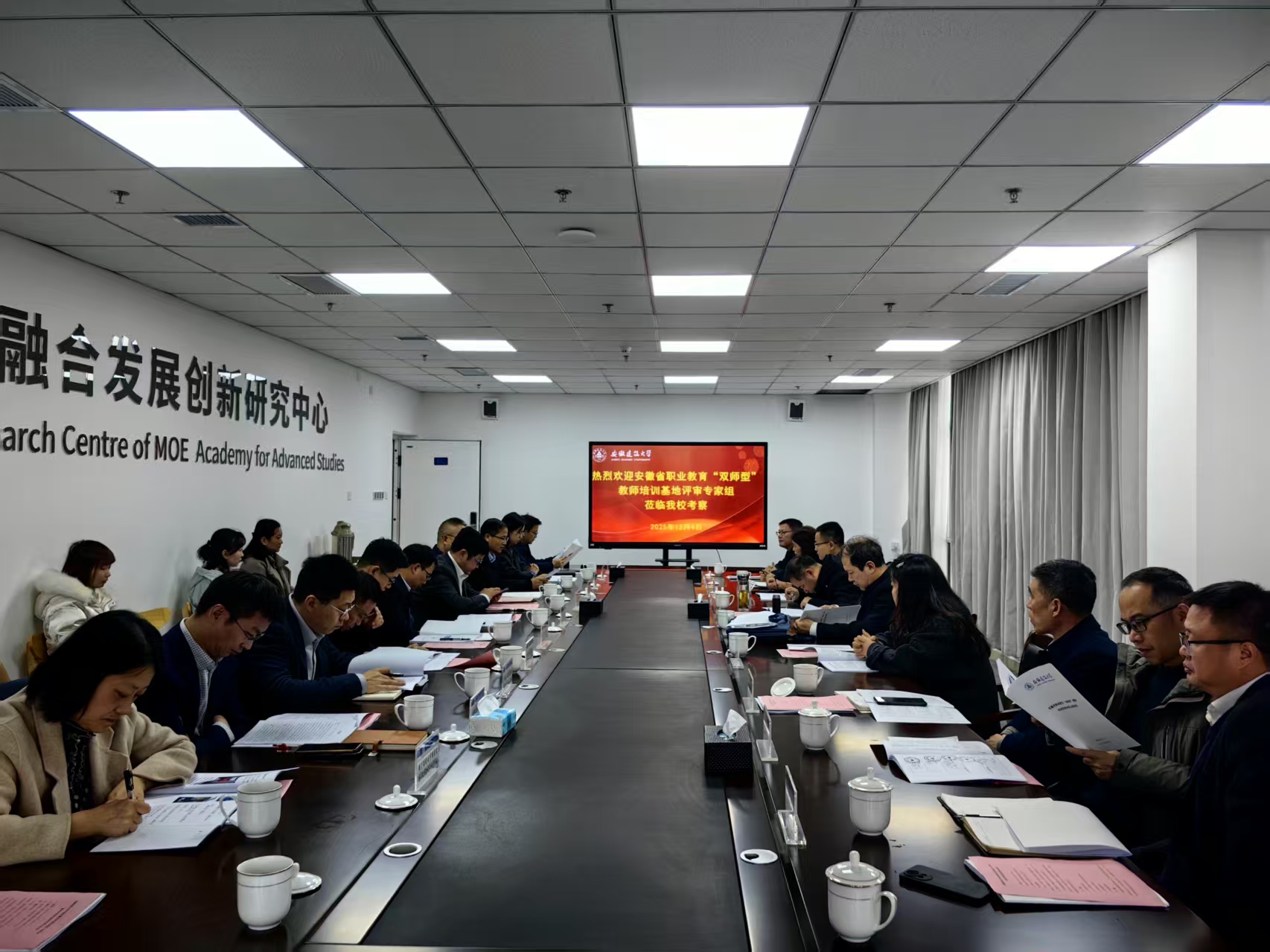 本网讯 12月4日上午,安徽省教育厅专家组朱曙培一行三人专程到访beat365在线唯一官网,对学校申报的建筑工程管理类“双师型”教师培训基地开展全方位实地考察。考察活动通过学校专题汇报、企业合作方陈述、专家集中反馈及实地调研等多个关键环节,系统评估基地申报规划的科学性、资源保障的坚实度与校企合作的深度,为基地高质量落地精准把脉、定向领航。