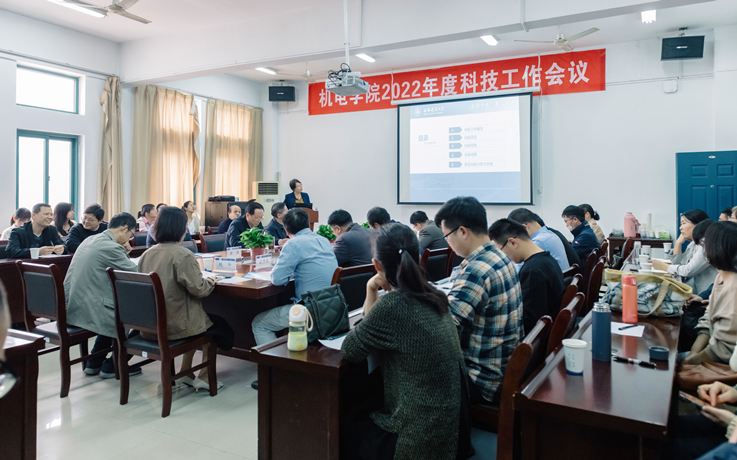 本网讯 2022年3月16日下午,机械与电气工程学院2022年度科技工作会议在机电南楼二楼会议室召开。副校长蔡新立亲临指导,科技成果转化中心、科技处领导应邀出席,机电学院党政领导、科研骨干及青年博士参加会议。会议由学院副院长陈中主持。