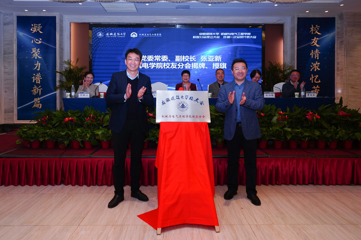 张亚新、叶少宝为机械与电气工程学院校友分会揭牌,张亚新为校友分会授旗。校友分会会长、副会长、秘书长上台合影留恋。