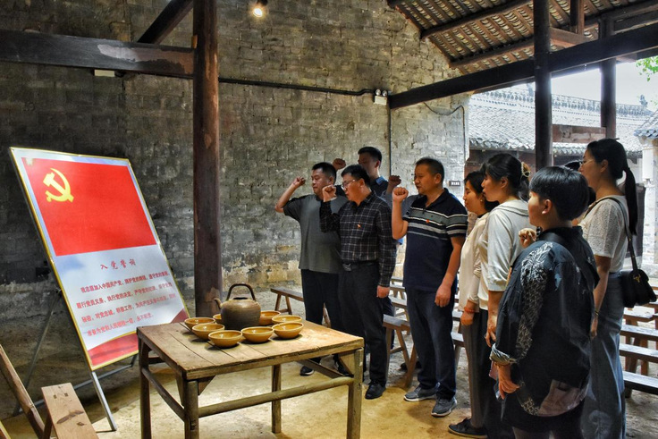 支部党员先后参观了豫东南和皖西北道委、道区苏维埃政府所在地接善寺旧址、赤色邮政局旧址、少共豫东南道委旧址。1932年夏,为了加强苏区党的领导和根据地建设,适应新的反“围剿”斗争,根据鄂豫皖省委指示,建立了豫东南道委、道区苏维埃政府。8月,豫东南道委机关迁驻汤家汇接善寺。此后,革命政权日益巩固,苏区范围逐渐扩大,革命烽火燃遍整个大别山区,为中国革命的胜利奠定了坚实的基础。支部党员们深入了解了在漫长艰难的革命岁月里,人民群众跟随共产党,抛头颅、洒热血,求解放,争自由的艰辛历程。在接善寺旧址,学院副院长黄磊带领大家面对党旗、高举右手,重温入党誓词。