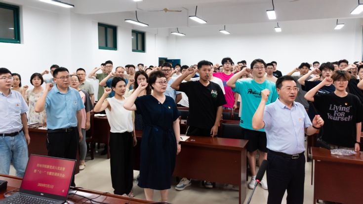 新党员入党宣誓,老党员重温誓词,学院党委书记叶少宝领誓。党员们面向党旗,列队肃立,举起右拳,誓言铮铮,久久回响。入党宣誓仪式,是深化党纪学习教育、坚定理想信念的具体实践,既是对新发展党员的一次深刻的党性教育,也是对其他党员思想上的一次洗礼,进一步激励了师生党员弘扬伟大建党精神,照亮初心使命,凝聚奋进力量的决心和斗志。