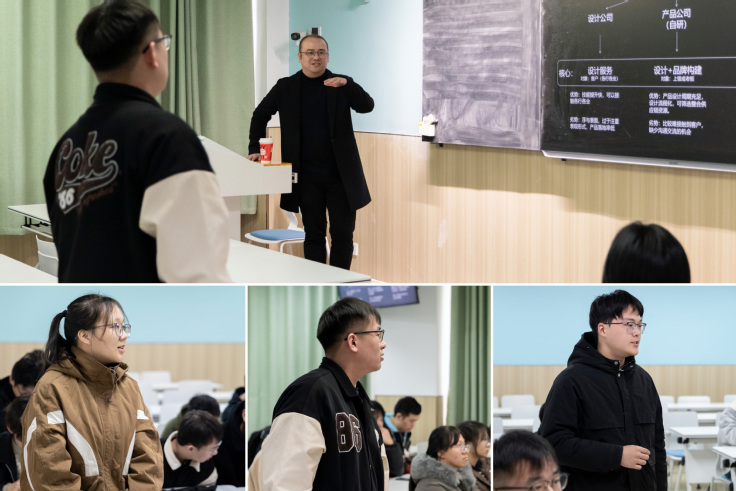 他还结合多年来在工业设计领域的学习和从业经验,对大学生学习期间设计技能的成长路径和毕业后的就业前景作了详细的解读和建议。交流互动环节中,学生们踊跃提问,双方对就业方向、面试细节、工作流程等细节问题展开了热烈的交流讨论。