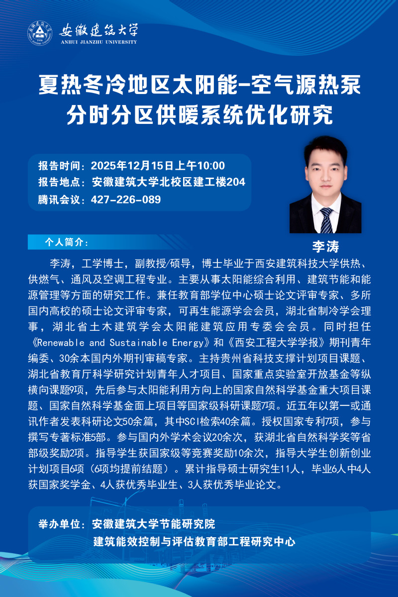 学术报告:夏执冬冷地区太阳能-空气源执泵分时分区供暖系统优化研究