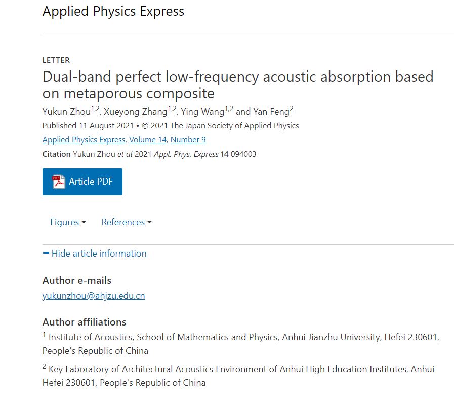 祝贺重点实验室周玉坤博士近日在《Applied Physics Express》发文“Dual-band perfect low-frequency acoustic absorption based on metaporous composite”